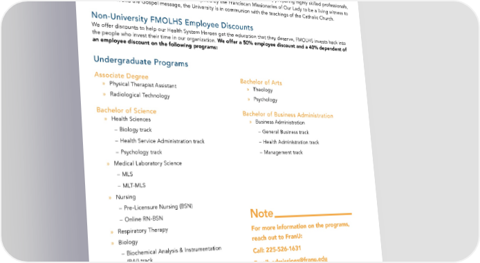 Franciscan Missionaries of Our Lady University (FranU) Discounts Mission Statement: The mission of Franciscan Missionaries of Our Lady University is to educate and form Franciscan servant leaders of all faiths. We honor and preserve the legacy of our founders by preparing highly skilled professionals, integrated thinkers, and faith-昀椀lled citizens. Inspired by the Franciscan Missionaries of Our Lady to be a living witness to Jesus Christ and the Gospel message, the University is in communion with the teachings of the Catholic Church. Non-University FMOLHS Employee Discounts We offer discounts to help our Health System Heroes get the education that they deserve. FMOLHS invests back into the people who invest their time in our organization. We offer a 50% employee discount and a 40% dependent of an employee discount on the following programs: Undergraduate Programs Associate Degree Bachelor of Arts » Physical Therapist Assistant » Theology » Radiological Technology » Psychology Bachelor of Science Bachelor of Business Administration » Health Sciences » Business Administration – Biology track – General Business track – Health Service Administration track – Health Administration track – Psychology track – Management track » Medical Laboratory Science – MLS – MLT-MLS » Nursing – Pre-Licensure Nursing (BSN) – Online RN-BSN Note » Respiratory Therapy For more information on the programs, » Biology reach out to FranU: – Biochemical Analysis & Instrumentation Call: 225-526-1631 (BAI) track – Pre-Professional Human Medicine track Email: [email protected] – Accelerated 3 + 2 Pathway to Physician Assistant Studies 55