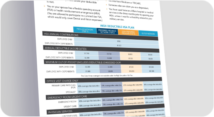 HDHSA HDHSA Plan – A high deductible health plan with a tax-free health savings account (HSA). You determine how much you’ll contribute to the account, when to use the money to pay for quali昀椀ed medical, prescription, dental and vision services, and when to reimburse yourself. HSAs allow you to save and roll over money if you do not spend it in the calendar year. The money in this account is portable, even if you change plans or jobs. Company HSA contributions will be pro-rated based on enrollment date. You cannot open an HSA if: » You have other health coverage that helps you pay » You also have Medicare or TRICARE. for health care expenses before your deductible » Someone else can claim you as a dependent. is met. » You have used Veterans Affairs hospital or medical » You or your spouse has a 昀氀exible spending account services in the three months prior to opening your (FSA) or health reimbursement arrangement (HRA). HSA, unless it was for a disability related to your (You are allowed to participate in a Limited Use FSA, military service. which would only cover Dental and Vision expenses.) HIGH DEDUCTIBLE HSA PLAN FMOLHS NETWORK PREFERRED PROVIDER NON-PREFERRED OUT-OF-NETWORK (TIER 1) NETWORK (TIER 2) PROVIDER (TIER 3) HSA ANNUAL CONTRIBUTIONS EMPLOYEE ONLY $750 EMPLOYEE WITH DEPENDENTS $1,500 ANNUAL DEDUCTIBLE (AGGREGATED) EMPLOYEE ONLY $1,750 $1,750 $3,500 $4,000 EMPLOYEE WITH DEPENDENTS $3,500 $3,500 $7,000 $8,000 MAXIMUM OUT-OF-POCKET (INCLUDES DEDUCTIBLE) (EMBEDDED OOP) EMPLOYEE ONLY $3,500 $4,000 $7,000 $10,500 EMPLOYEE WITH DEPENDENTS $7,000 $8,000 $14,000 $21,000 The Out of Area coverage is not available under the High Deductible HSA Plan. OFFICE VISIT CHARGE ONLY PRIMARY CARE PHYSICIAN (PCP) 80% coverage after deductible 70% coverage after deductible 60% coverage after deductible 40% coverage after deductible SPECIALIST 80% coverage after deductible 70% coverage after deductible 60% coverage after deductible 40% coverage after deductible EMERGENCY ROOM/URGENT CARE EMERGENCY ROOM 80% coverage after deductible 80% coverage after deductible 80% coverage after deductible 80% coverage after deductible URGENT CARE 80% coverage after deductible 70% coverage after deductible 60% coverage after deductible 40% coverage after deductible PHYSICIAN SERVICES INPATIENT VISITS 80% coverage after deductible 70% coverage after deductible 60% coverage after deductible 40% coverage after deductible OUTPATIENT 80% coverage after deductible 70% coverage after deductible 60% coverage after deductible 40% coverage after deductible HOSPITAL SERVICES ROOM AND BOARD 80% coverage after deductible 70% coverage after deductible 60% coverage after deductible 40% coverage after deductible INTENSIVE CARE UNIT 80% coverage after deductible 70% coverage after deductible 60% coverage after deductible 40% coverage after deductible SURGERY 80% coverage after deductible 70% coverage after deductible 60% coverage after deductible 40% coverage after deductible SKILLED NURSING FACILITY 80% coverage after deductible 70% coverage after deductible 60% coverage after deductible 40% coverage after deductible 21