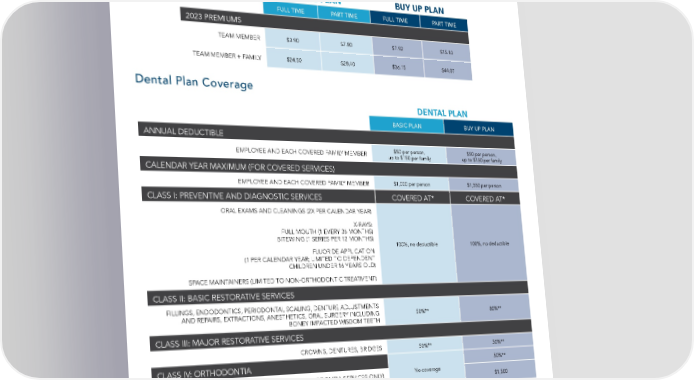 Dental Premiums Dental premium contributions will be deducted from your paycheck on a before-tax basis. Your tier of coverage will determine your semi-monthly premiums (24 deductions). BASIC PLAN BUY UP PLAN FULL TIME PART TIME FULL TIME PART TIME 2023 PREMIUMS TEAM MEMBER $3.90 $7.80 $7.92 $15.83 TEAM MEMBER + FAMILY $24.50 $28.40 $36.15 $44.07 Dental Plan Coverage DENTAL PLAN BASIC PLAN BUY UP PLAN ANNUAL DEDUCTIBLE EMPLOYEE AND EACH COVERED FAMILY MEMBER $50 per person, $50 per person, up to $150 per family up to $150 per family CALENDAR YEAR MAXIMUM (FOR COVERED SERVICES) EMPLOYEE AND EACH COVERED FAMILY MEMBER $1,000 per person $1,550 per person CLASS I: PREVENTIVE AND DIAGNOSTIC SERVICES COVERED AT* COVERED AT* ORAL EXAMS AND CLEANINGS (2X PER CALENDAR YEAR) X-RAYS: FULL MOUTH (1 EVERY 36 MONTHS) BITEWING (1 SERIES PER 12 MONTHS) 100%, no deductible 100%, no deductible FLUORIDE APPLICATION (1 PER CALENDAR YEAR; LIMITED TO DEPENDENT CHILDREN UNDER 16 YEARS OLD) SPACE MAINTAINERS (LIMITED TO NON-ORTHODONTIC TREATMENT) CLASS II: BASIC RESTORATIVE SERVICES FILLINGS, ENDODONTICS, PERIODONTAL SCALING, DENTURE ADJUSTMENTS AND REPAIRS, EXTRACTIONS, ANESTHETICS, ORAL SURGERY INCLUDING 50%** 80%** BONEY IMPACTED WISDOM TEETH CLASS III: MAJOR RESTORATIVE SERVICES CROWNS, DENTURES, BRIDGES 50%** 50%** 50%** CLASS IV: ORTHODONTIA LIFETIME MAXIMUM (FOR ORTHODONTIA SERVICES ONLY) No coverage APPLIES TO DEPENDENT CHILDREN LESS THAN 19 YEARS OF AGE $1,500 * Up to a maximum allowed charge (excludes exams, cleanings and x-rays) ** After plan deductible. Note Extraction of wisdom teeth, including bony impacted teeth, is covered under the Dental Plan only and requires pre-certi昀椀cation prior to services. 36