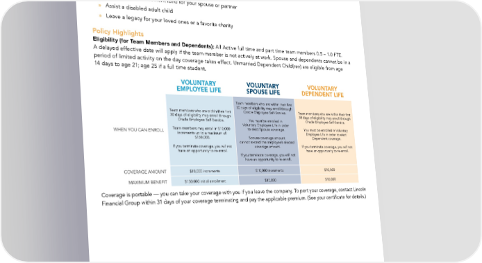 Voluntary Term Life Insurance Live for now. Plan for then. Every day, you provide for the ones you love. You make sure they’re happy and secure, with thoughtful touches to let them know you care. Life insurance lets you plan for the future and continue to show your love even after you’re gone. Life insurance can help: » Protect your loved ones from 昀椀nancial burdens » Pay for your children’s or grandchildren’s education » Build a secure retirement fund for your spouse or partner » Assist a disabled adult child » Leave a legacy for your loved ones or a favorite charity Policy Highlights Eligibility (for Team Members and Dependents): All Active full time and part time team members 0.5 – 1.0 FTE. A delayed effective date will apply if the team member is not actively at work. Spouse and dependents cannot be in a period of limited activity on the day coverage takes effect. Unmarried Dependent Child(ren) are eligible from age 14 days to age 21; age 25 if a full time student. VOLUNTARY VOLUNTARY VOLUNTARY EMPLOYEE LIFE SPOUSE LIFE DEPENDENT LIFE Team members who are within their 昀椀rst 30 days of eligibility may enroll through Team members who are within their 昀椀rst Oracle Employee Self-Service. Team members who are within their 昀椀rst 30 days of eligibility may enroll through 30 days of eligibility may enroll through Oracle Employee Self-Service. You must be enrolled in Oracle Employee Self-Service. Voluntary Employee Life in order WHEN YOU CAN ENROLL Team members may enroll in $10,000 to elect Spouse coverage. You must be enrolled in Voluntary increments up to a maximum of Employee Life in order to elect $150,000. Spouse coverage amount Dependent coverage. cannot exceed the employee’s elected If you terminate coverage, you will not coverage amount. If you terminate coverage, you will not have an opportunity to re-enroll. have an opportunity to re-enroll. If you terminate coverage, you will not have an opportunity to re-enroll. COVERAGE AMOUNT $10,000 increments $10,000 increments $10,000 MAXIMUM BENEFIT $150,000 initial enrollment $30,000 $10,000 Coverage is portable — you can take your coverage with you if you leave the company. To port your coverage, contact Lincoln Financial Group within 31 days of your coverage terminating and pay the applicable premium. (See your certi昀椀cate for details.) Note You can designate a bene昀椀ciary when making your New Hire/Newly Eligible bene昀椀t elections in Oracle Employee Self Service under Me/Bene昀椀ts. When making your elections, you will be prompted to designate a bene昀椀ciary under the Life Insurance section. 51