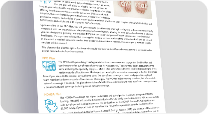 Which Plan Is Right for Me — the EPO Plan, PPO Plan or HDHSA Plan? Choosing the most cost-effective health plan is more than just signing up for the one with the lowest paycheck deduction. EPO Plan The EPO Plan provides access to a narrow network of healthcare providers that are either a part of our health system or considered our preferred partners. This means that the plan will allow for eligible medical services as long as you visit a healthcare provider — doctor, hospital or other place offering health care services — within our narrow EPO network. With this plan, the cost shared by you will be lower, whether that is through premiums, copays, deductibles or your out-of-pocket-maximum limit for the year. The plan offers a $250 individual and $500 family deductible and a $0 copay for PCP of昀椀ce visits. Upon enrolling in the EPO Plan, you will gain access to providers who offer high quality care and who are more clinically integrated with our organization’s electronic medical record system, allowing for more comprehensive care. In addition, you can designate a primary care provider (PCP) that can act as your personal health advocate and coordinate your healthcare. It’s important to know that coverage for medical services outside of the EPO network will only be allowed in the event a medical service is needed that is not available within the network. In an emergency, however, eligible services will be covered. This plan may be a better option for those who would like lower deductibles and copays at time of service as well as overall reduced out-of-pocket expense. PPO Plan The PPO health plan design has higher deductibles, coinsurance and copays than the EPO Plan, and continues to offer out-of-network coverage for most services. The pharmacy design copays remain the same including the specialty copays — $100 if 昀椀lled at RxONE and $150 if 昀椀lled by Express Scripts. If you reside outside of Louisiana or Mississippi, you are eligible for out-of-area coverage at the Tier 2 coverage level if you see a BCBS provider in your home state. The out-of-area coverage is based solely upon the employed team member’s address outside of Louisiana or Mississippi. The PPO has higher monthly premiums, but offers out-of- network coverage if needed. This plan choice is bene昀椀cial for those individuals who need out-of-area coverage or need a broader network coverage including out-of-network coverage. HDHSA Plan The HDHSA Plan design has higher deductibles and out-of-pocket maximums along with FMOLHS funding. FMOLHS will provide $750 individual and $1500 family contribution to your HSA account to help with out-of-pocket medical expenses. The deductibles for the HDHSA Plan are $1,750 individual and $3,500 family. If you can take on more 昀椀nancial risk, perhaps you might consider the HDHSA Plan. With a High Deductible Health Plan and a Health Savings Account (HSA), you can save additional pre-tax dollars to pay for medical expenses. You decide how to spend your dollars. Unused HSA dollars roll over from year-to- year. (There are restrictions and limitations to enrollment in the HSA.) 14