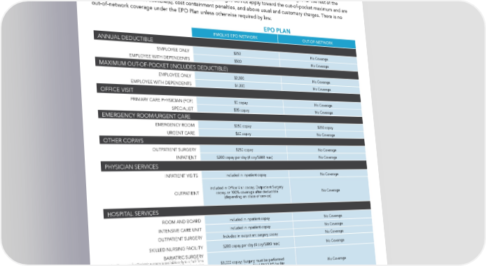 Health Plan Summaries The charts below give a summary of the 2023 Health Plans for FMOLHS. All covered services are subject to medical necessity as determined by the Plan. All out-of-network services are subject to reasonable and customary (R&C) limitations. EPO Plan The Plan will pay the designated percentage of covered charges if the provider is in the EPO network until out-of-pocket amounts are reached, at which time the Plan will pay 100% of the remainder of covered charges for the rest of the calendar year unless stated otherwise. The following charges do not apply toward the out-of-pocket maximum and are never paid at 100%: deductible(s), cost containment penalties, and above usual and customary charges. There is no out-of-network coverage under the EPO Plan unless otherwise required by law. EPO PLAN FMOLHS EPO NETWORK OUT-OF-NETWORK ANNUAL DEDUCTIBLE EMPLOYEE ONLY $250 No Coverage EMPLOYEE WITH DEPENDENTS $500 No Coverage MAXIMUM OUT-OF-POCKET (INCLUDES DEDUCTIBLE) EMPLOYEE ONLY $2,000 No Coverage EMPLOYEE WITH DEPENDENTS $4,000 No Coverage OFFICE VISIT PRIMARY CARE PHYSICIAN (PCP) $0 copay No Coverage SPECIALIST $35 copay No Coverage EMERGENCY ROOM/URGENT CARE EMERGENCY ROOM $250 copay $250 copay URGENT CARE $60 copay No Coverage OTHER COPAYS OUTPATIENT SURGERY $250 copay No Coverage INPATIENT $200 copay per day (4 day/$800 max) No Coverage PHYSICIAN SERVICES INPATIENT VISITS Included in Inpatient copay No Coverage Included in Of昀椀ce Visit copay, Outpatient Surgery OUTPATIENT copay, or 100% coverage after deductible No Coverage (depending on place of service) HOSPITAL SERVICES ROOM AND BOARD Included in Inpatient copay No Coverage INTENSIVE CARE UNIT Included in Inpatient copay No Coverage OUTPATIENT SURGERY Included in outpatient surgery copay No Coverage SKILLED NURSING FACILITY $200 copay per day (4 day/$800 max) No Coverage BARIATRIC SURGERY Plan Coverage for Bariatric surgery is available only to a Full-Time $3,000 copay; Surgery must be performed or Part-Time Active employee who is a Class A Participant who No Coverage remains in that status on the date of service and satis昀椀es the at a MBSAQIP Accredited FMOLHS facility requirements in Exhibit C and employee’s covered spouse and dependent who satis昀椀es the requirements in Exhibit C. ORGAN TRANSPLANT 90% coverage after deductible when performed No Coverage Blue Distinction Centers coverage only. at Blue Distinction Center facility OTHER SERVICES ALLERGY TESTING 90% coverage after deductible or included in of昀椀ce visit No Coverage copay, depending on place of service ALLERGY SERUM AND INJECTIONS 90% coverage after deductible or included in of昀椀ce visit No Coverage copay, depending on place of service OTHER INJECTIONS 90% coverage after deductible or included in of昀椀ce visit copay, depending on place of service 17