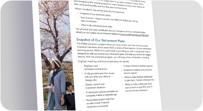 My Retirement Bene昀椀ts Our retirement bene昀椀ts are a cornerstone of our bene昀椀t program and demonstrate our support for you as you plan for your future. Our goal is to ensure we have a strong, sustainable bene昀椀t for many years to come while continuing to invest as we always have in our team members' future. We’re also recognizing the increasing desire for team members to have more control of their retirement bene昀椀ts and how they plan for their future. What’s included in this section (and why it’s important) » Snapshot of our retirement plans » How to enroll – Steps to enroll in the FMOLHS 403(b) plan during open enrollment » What to do and resources to help You will enroll and make contribution election changes to all of our retirement plans directly on our custom Lincoln Financial website at www.LincolnFinancial.com/FMOLHS. Snapshot of Our Retirement Plans The 403(b) retirement program allows you more control over how much you save, investment decisions and to select from a variety of fund options. As your retirement planning partner, FMOLHS is committed to providing you with a robust plan that is designed to help you pursue your retirement goals, and help you build even bigger dreams. With the retirement program, you will enjoy a host of bene昀椀ts, including: Employer matching contributions (see below for details) » Employer core » A range of diverse investment options retirement contributions » Exceptional website and customer » A fully portable plan that moves service support with you when you retire or » Ability to make hardship withdrawals change jobs or plan loans, if certain criteria are met » Greater control over » Ability to make withdrawals from investment decisions your account at age 59½, even if » A robust plan website accessible via you are actively employed computer, mobile or wearable app » Personalized expert help from on-site Lincoln Financial retirement consultants 44