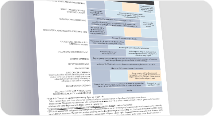 2023 ADULT PREVENTIVE SERVICE RECOMMENDATIONS¹ THIS CHART IS INTENDED AS A REFERENCE TOOL FOR YOUR CONVENIENCE. AGE 21-39 40-49 50-64 65 or older PREVENTION/SCREENING One time screening by ABDOMINAL AORTIC ANEURYSM SCREENING ultrasonography in men ages 65-75 who have ever smoked BREAST CANCER SCREENING As recommended Screening mammography, every year, for by your health care women age 40 years and older, with or without (BRCA²; MEDICATION³) provider* clinical breast examination Cytology (Pap smear) every 3 years women ages 21 – 65 or As recommended CERVICAL CANCER SCREENING by your health care Ages 30 – 65 years who want to lengthen the interval, screening with a provider* combination of cytology & human papillomavirus (HPV) testing every 5 yrs. Men ages 20 – 35 for lipid disorders if they are at increased risk for CHOLESTEROL ABNORMALITIES SCREENING: MEN coronary heart disease Men ages 35 and older for lipid disorders Women ages 30 – 45 years for lipid disorders if they CHOLESTEROL ABNORMALITIES are at increased risk for coronary heart disease SCREENING: WOMEN Women age 45 years and older for lipid disorders As recommended by your Adults beginning at age 45, fecal occult blood COLORECTAL CANCER SCREENING testing annually, sigmoidoscopy every 5 years, or health care provider* colonoscopy every 10 years DIABETES SCREENING Beginning at age 45 (If you have high blood pressure or high cholesterol, are overweight, or have a close family history of diabetes, you should consider an earlier screening.) HEPATITIS C SCREENING Adults age 18 – 79 without known liver disease, a one-time screening for hepatitis C virus (HCV) 4 IMMUNIZATIONS Refer to the CDC’s posted schedule of immunizations LUNG CANCER SCREENING Annual screening with low-dose computed Screening should be discontinued once a person has not tomography in adults age 50 – 80 years who have a smoked for 15 years or develops a health problem that substantially limits life expectancy or the ability or 20 pack-year smoking history and currently smoke or have quit within the past 15 years. willingness to have curative lung surgery OSTEOPOROSIS SCREENING Bone density in younger women whose fracture risk is equal to or greater than Bone density for women that of a 65 year old white woman who has no additional risk factors. age 65 years or older WELLNESS OFFICE VISIT: PHYSICAL EXAM, BLOOD PRESSURE, BODY MASS INDEX (BMI) Annually * High Risk: There is no age limit for screening if you are at high risk: Colon cancer: If you or a close relative had colorectal polyps or colorectal cancer or if you have in昀氀ammatory bowel disease. Breast cancer: This might include women who carry genes that increase their risk of breast cancer, such as the “BRCA” genes or who have close relatives who were diagnosed with breast cancer at a young age. ¹ https://www.uspreventiveservicestaskforce.org/uspstf/recommendation-topics (current as of June 2022) ² BRCA risk assessment and genetic counseling/testing: Screen women whose family history may be associated with an increased risk for potentially harmful BRCA mutations. Women with positive screening results should receive genetic counseling and, if indicated after counseling, BRCA testing. ³ Breast cancer preventive medications: Asymptomatic women aged ≥35 years without a prior diagnosis of breast cancer who are at increased risk for the disease. Clinicians engage in shared, informed decision making with women who are at increased risk for breast cancer about medications to reduce their risk. 4 Adult immunizations: https://www.cdc.gov/vaccines/schedules/index.html Additional preventive care bene昀椀ts may be covered under the health plan. 30