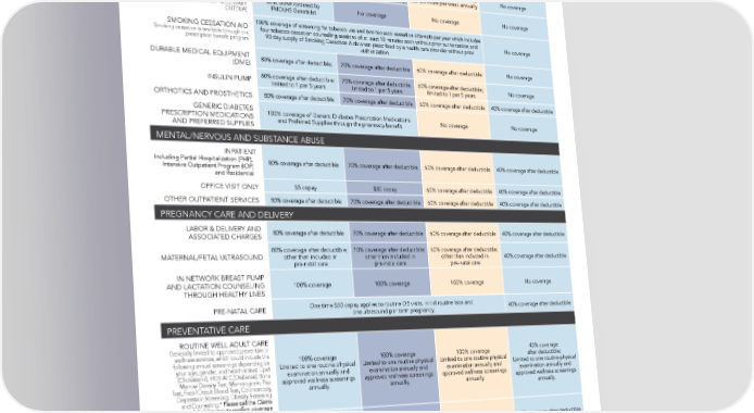 PPO PLAN (CONTINUED) FMOLHS NETWORK PREFERRED PROVIDER NON-PREFERRED OUT-OF-NETWORK (TIER 1) NETWORK (TIER 2) PROVIDER (TIER 3) OTHER SERVICES OCCUPATIONAL THERAPY 80% coverage after deductible; 70% coverage after deductible 60% coverage after deductible PHYSICAL THERAPY No coverage SPEECH THERAPY Maximum of 120 visits per year (and maximum of 20 visits per week) combined with Occupational, Physical, and Speech Therapy 70% coverage after deductible; 80% coverage after deductible; 60% coverage after deductible; APPLIED BEHAVIOR ANALYSIS (ABA) No coverage max 20 hours per week annually max 20 hours per week annually max 20 hours per week annually SPECIFIC GENETIC TESTING 80%; drawn/ordered by (MUST SATISFY MEDICALLY NECESSARY No coverage No coverage No coverage CRITERIA) FMOLHS Geneticist SMOKING CESSATION AID 100% coverage of screening for tobacco use and two tobacco cessation attempts per year which includes four tobacco cessation counseling sessions of at least 10 minutes each without prior authorization and No coverage Smoking cessation is available through the 90 day supply of Smoking Cessation Aids when prescribed by a health care provider without prior prescription bene昀椀t program authorization DURABLE MEDICAL EQUIPMENT (DME) 80% coverage after deductible; 70% coverage after deductible 60% coverage after deductible No coverage 80% coverage after deductible; 70% coverage after deductible; 60% coverage after deductible; INSULIN PUMP No coverage limited to 1 per 5 years limited to 1 per 5 years limited to 1 per 5 years ORTHOTICS AND PROSTHETICS 80% coverage after deductible 70% coverage after deductible 60% coverage after deductible 40% coverage after deductible GENERIC DIABETES 100% coverage of Generic Diabetes Prescription Medications PRESCRIPTION MEDICATIONS No coverage No coverage AND PREFERRED SUPPLIES and Preferred Supplies through the pharmacy bene昀椀t MENTAL/NERVOUS AND SUBSTANCE ABUSE INPATIENT Including Partial Hospitalization (PHP), 80% coverage after deductible 70% coverage after deductible 60% coverage after deductible 40% coverage after deductible Intensive Outpatient Program (IOP) and Residential OFFICE VISIT ONLY $5 copay $30 copay 60% coverage after deductible 40% coverage after deductible OTHER OUTPATIENT SERVICES 80% coverage after deductible 70% coverage after deductible 60% coverage after deductible 40% coverage after deductible PREGNANCY CARE AND DELIVERY LABOR & DELIVERY AND ASSOCIATED CHARGES 80% coverage after deductible 70% coverage after deductible 60% coverage after deductible 40% coverage after deductible 80% coverage after deductible; 70% coverage after deductible; 60% coverage after deductible; MATERNAL/FETAL ULTRASOUND other than included in other than included in other than included in 40% coverage after deductible pre-natal care pre-natal care pre-natal care IN NETWORK BREAST PUMP AND LACTATION COUNSELING 100% coverage 100% coverage 100% coverage No coverage THROUGH HEALTHY LIVES One time $50 copay applies to routine OB visits, initial routine labs and PRE-NATAL CARE 40% coverage after deductible one ultrasound per term pregnancy. PREVENTATIVE CARE ROUTINE WELL ADULT CARE Generally limited to approved preventive or wellness services, which could include the 40% coverage 100% coverage 100% coverage 100% coverage following annual screenings depending on after deductible; Limited to one routine physical Limited to one routine physical Limited to one routine physical your age, gender, and health status: Lipid Limited to one routine physical examination annually and examination annually and examination annually and (Cholesterol), HGB A1C (Diabetes), Bone examination annually and Marrow Density Test, Mammogram, Pap approved wellness screenings approved wellness screenings approved wellness screenings approved wellness screenings Test, Fecal Occult Blood Test, Colonoscopy, annually. annually. annually. annually. Depression Screening, Obesity Screening and Counseling.* Please call the Claims Administrator to con昀椀rm coverage ADULT IMMUNIZATIONS Immunizations are subject to current CDC 100% coverage 100% coverage 100% coverage 40% coverage after deductible Recommendations which include age limitations ROUTINE WELL CHILD CARE Unlimited routine of昀椀ce visits through age two (2); annually ages three (3) up. Includes: 100% coverage 100% coverage 100% coverage 40% coverage after deductible of昀椀ce visits, routine physical examination and immunizations in accordance with CDC Guidelines and preventive care in accordance with federal guidelines. *FMOLHS follows federal guidelines for coverage of preventive wellness screenings. 20