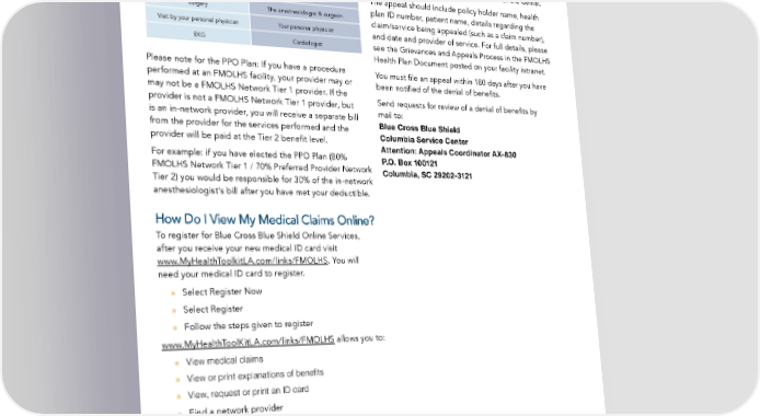 How Will I Be Billed for Medical Services? What If a Medical Service or a Claim Is The chart below gives examples of medical services Denied? What Are My Appeal Rights? that require the attention of a physician who may send a When a claim for bene昀椀ts or service denial occurs separate bill for payment. under the FMOLHS Health Plan, the member receives an explanation of bene昀椀ts (EOB) or service denial letter YOU WILL ALSO RECEIVE IF YOU HAVE: A BILL FROM: explaining the reason for the denial. The member has the right to 昀椀le an appeal to request a review of the denial. X-rays The radiologist The appeal should include policy holder name, health Certain lab tests The pathologist plan ID number, patient name, details regarding the Surgery The anesthesiologist & surgeon claim/service being appealed (such as a claim number), Visit by your personal physician Your personal physician and date and provider of service. For full details, please EKG Cardiologist see the Grievances and Appeals Process in the FMOLHS Health Plan Document posted on your facility intranet. Please note for the PPO Plan: If you have a procedure You must 昀椀le an appeal within 180 days after you have performed at an FMOLHS facility, your provider may or been noti昀椀ed of the denial of bene昀椀ts. may not be a FMOLHS Network Tier 1 provider. If the Send requests for review of a denial of bene昀椀ts by provider is not a FMOLHS Network Tier 1 provider, but mail to: is an in-network provider, you will receive a separate bill Blue Cross Blue Shield from the provider for the services performed and the Columbia Service Center provider will be paid at the Tier 2 bene昀椀t level. Attention: Appeals Coordinator AX-830 For example: if you have elected the PPO Plan (80% P.O. Box 100121 FMOLHS Network Tier 1 / 70% Preferred Provider Network Columbia, SC 29202-3121 Tier 2) you would be responsible for 30% of the in-network anesthesiologist’s bill after you have met your deductible. How Do I View My Medical Claims Online? To register for Blue Cross Blue Shield Online Services, after you receive your new medical ID card visit www.MyHealthToolkitLA.com/links/FMOLHS. You will need your medical ID card to register. » Select Register Now » Select Register » Follow the steps given to register www.MyHealthToolKitLA.com/links/FMOLHS allows you to: » View medical claims » View or print explanations of bene昀椀ts » View, request or print an ID card » Find a network provider 16