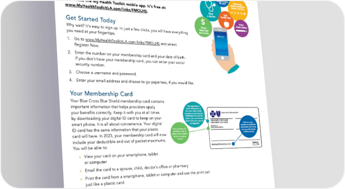 Important Information Be Healthy. Be Happy. Register for My Health Toolkit to help you get started. You will have anywhere, anytime access to your bene昀椀ts information, insurance cards, claims and covered local providers. Download the My Health Toolkit mobile app. It’s free at: www.MyHealthToolkitLA.com/links/FMOLHS. Get Started Today Why wait? It’s easy to sign up. In just a few clicks, you will have everything you need at your 昀椀ngertips. 1. Go to www.MyHealthToolkitLA.com/links/FMOLHS and select Register Now. 2. Enter the number on your membership card and your date of birth. If you don’t have your membership card, you can enter your social security number. 3. Choose a username and password. 4. Enter your email address and choose to go paperless, if you would like. Your Membership Card Your Blue Cross Blue Shield membership card contains important information that helps providers apply your bene昀椀ts correctly. Keep it with you at all times by downloading your digital ID card to keep on your smart phone. It is all about convenience. Your digital ID card has the same information that your plastic card will have. In 2023, your membership card will now include your deductible and out of pocket maximums. You will be able to: » View your card on your smartphone, tablet or computer » Email the card to a spouse, child, doctor’s of昀椀ce or pharmacy » Print the card from a smartphone, tablet or computer and use the print out just like a plastic card Accessing your Digital ID Card To access your digital ID card through the My Health Toolkit app you will need to follow these instructions: » Log in to My Health Toolkit. Note » From your mobile device, select Insurance Card. Sign Up for My Health Toolkit at: » From a computer select Insurance Card and then www.MyHealthToolkitLA.com/links/FMOLHS View Your Card. 6