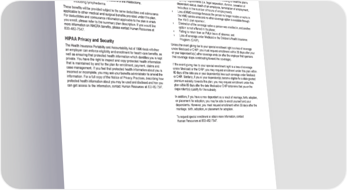 Women’s Health and Cancer Rights Act HIPAA Special Enrollment Rights If you have had or are going to have a mastectomy, you may be entitled to If you are declining enrollment for yourself or your dependents (including your certain benefits under the Women’s Health and Cancer Rights Act of 1998 spouse) because of other health insurance or group health plan coverage, you (WHCRA). For individuals receiving mastectomy‑related benefits, coverage will may be able to later enroll yourself and your dependents in this plan if you or be provided in a manner determined in consultation with the attending physician your dependents lose eligibility for that other coverage (or if the employer stops and the patient, for: contributing towards your or your dependents’ other coverage). » All stages of reconstruction of the breast on which the mastectomy Loss of eligibility includes but is not limited to: was performed; » Surgery and reconstruction of the other breast to produce a » Loss of eligibility for coverage as a result of ceasing to meet the plan’s symmetrical appearance; eligibility requirements (i.e. legal separation, divorce, cessation of » Prostheses; and dependent status, death of an employee, termination of employment, » Treatment of physical complications of the mastectomy, reduction in the number of hours of employment); including lymphedema. Loss of HMO coverage because the person no longer resides or works in » These benefits will be provided subject to the same deductibles and coinsurance the HMO service area and no other coverage option is available through applicable to other medical and surgical benefits provided under this plan. the HMO plan sponsor; For deductibles and coinsurance information applicable to the plan in which » Elimination of the coverage option a person was enrolled in, and another you enroll, please refer to the summary plan description. If you would like option is not offered in its place; Failing to return from an FMLA leave of absence; and more information on WHCRA benefits, please contact Human Resources at » 833‑482‑7547. » Loss of coverage under Medicaid or the Children’s Health Insurance Program (CHIP). HIPAA Privacy and Security Unless the event giving rise to your special enrollment right is a loss of coverage under Medicaid or CHIP, you must request enrollment within 30 days after your The Health Insurance Portability and Accountability Act of 1996 deals with how or your dependent’s(s’) other coverage ends (or after the employer that sponsors an employer can enforce eligibility and enrollment for health care benefits, as well as ensuring that protected health information which identifies you is kept that coverage stops contributing toward the coverage). private. You have the right to inspect and copy protected health information If the event giving rise to your special enrollment right is a loss of coverage that is maintained by and for the plan for enrollment, payment, claims and under Medicaid or the CHIP, you may request enrollment under this plan within case management. If you feel that protected health information about you is 60 days of the date you or your dependent(s) lose such coverage under Medicaid incorrect or incomplete, you may ask your benefits administrator to amend the information. For a full copy of the Notice of Privacy Practices, describing how or CHIP. Similarly, if you or your dependent(s) become eligible for a state‑granted protected health information about you may be used and disclosed and how you premium subsidy towards this plan, you may request enrollment under this can get access to the information, contact Human Resources at 833‑482‑7547. plan within 60 days after the date Medicaid or CHIP determine that you or the dependent(s) qualify for the subsidy. In addition, if you have a new dependent as a result of marriage, birth, adoption, or placement for adoption, you may be able to enroll yourself and your dependents. However, you must request enrollment within 30 days after the marriage, birth, adoption, or placement for adoption. To request special enrollment or obtain more information, contact ‑482‑7547. Human Resources at 833 59 59
