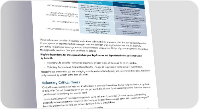 My Voluntary Bene昀椀ts FMOLHS offers special voluntary bene昀椀ts, through Lincoln Life Insurance Company to all eligible team members. These bene昀椀ts are designed to provide 昀椀nancial security at an affordable price. VOLUNTARY BENEFIT PLANS PLAN NEW ENROLLEES FUTURE ENROLLEES Team members who are within their 昀椀rst 30 days of Enrollment in coverage is not available LINCOLN VOLUNTARY EMPLOYEE LIFE eligibility may enroll through Oracle Employee Self at any future date for team members Service. Team Members may elect coverage in $10,000 who do not enroll within their 昀椀rst increments up to a maximum of $150,000. 30 calendar days of eligibility. LINCOLN VOLUNTARY SPOUSE LIFE Team members who are within their 昀椀rst Enrollment in coverage is not available at any future LINCOLN VOLUNTARY DEPENDENT LIFE 30 days of eligibility may enroll through date for team members who do not enroll within their Oracle Employee Self Service. 昀椀rst 30 calendar days of eligibility. Team members who are within their 昀椀rst Eligible to enroll in coverage during LINCOLN VOLUNTARY ACCIDENT 30 days of eligibility may enroll through annual Open Enrollment period. Oracle Employee Self Service. Team members who are within their 昀椀rst Eligible to enroll in coverage during LINCOLN VOLUNTARY CRITICAL ILLNESS 30 days of eligibility may enroll through annual Open Enrollment period. Oracle Employee Self Service. These policies are portable. If coverage under these policies ends for any reason other than non-payment of premium or your spouse or dependent child ceasing to meet the de昀椀nition of an eligible dependent, they are eligible for portability. To port your coverage, contact Lincoln Financial Group within 31 days of your coverage terminating and pay the applicable premium. (See your certi昀椀cate for details.) Eligible dependents for these plans include your legal spouse and dependent children as de昀椀ned below by bene昀椀t. » Voluntary Life Bene昀椀ts – Unmarried dependent children to age 21; to age 25 if a full time student. » Voluntary Accident and Critical Illness Bene昀椀ts – To age 26 regardless of marital status or student status. Note: Please ensure that you are managing your dependent child’s eligibility and enrollment in these plans. Eligibility is only reviewed by Lincoln at the time of a claim. Voluntary Critical Illness Critical Illness coverage can help and it's affordable. If a serious illness strikes, the last thing you want to worry about is bills. With Critical Illness insurance, you can get a cash bene昀椀t even if you’re receiving bene昀椀ts from other insurance. Use the cash for anything you want or need. SM Lincoln CareCompass services: your guide to being well even if you’re sick. Of course, money isn’t everything, SM especially when someone is critically ill. That’s why our Critical Illness coverage comes with Lincoln CareCompass bene昀椀ts and services to help you before, during and after a critical illness. » You do not have to be terminally ill to receive bene昀椀ts. » Coverage is available for you and your spouse. Eligible children are covered for $5,000 at no additional cost. » A Health Screening Bene昀椀t is included, which provides a $75 bene昀椀t per insured team member and/or spouse per calendar year for a covered health screening test. » Coverage is portable — you can take your plan with you if you change jobs or retire. (See your certi昀椀cate for details.) 48