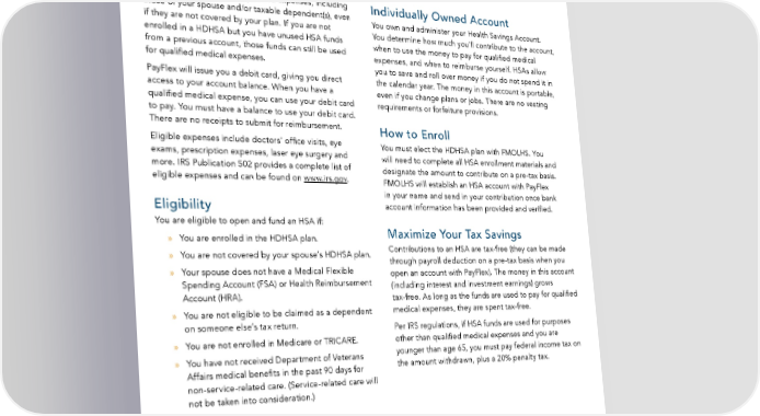 My Health Savings Accounts – HSA Take charge of your health care spending with a Health Savings Account (HSA). Contributions to an HSA are tax free and withdrawals for quali昀椀ed medical expenses are tax free. Your HSA can be used for quali昀椀ed expenses, including those of your spouse and/or taxable dependent(s), even Individually Owned Account You own and administer your Health Savings Account. if they are not covered by your plan. If you are not You determine how much you’ll contribute to the account, enrolled in a HDHSA but you have unused HSA funds from a previous account, those funds can still be used when to use the money to pay for quali昀椀ed medical expenses, and when to reimburse yourself. HSAs allow for quali昀椀ed medical expenses. you to save and roll over money if you do not spend it in PayFlex will issue you a debit card, giving you direct the calendar year. The money in this account is portable, access to your account balance. When you have a even if you change plans or jobs. There are no vesting quali昀椀ed medical expense, you can use your debit card requirements or forfeiture provisions. to pay. You must have a balance to use your debit card. There are no receipts to submit for reimbursement. How to Enroll Eligible expenses include doctors’ of昀椀ce visits, eye You must elect the HDHSA plan with FMOLHS. You exams, prescription expenses, laser eye surgery and will need to complete all HSA enrollment materials and more. IRS Publication 502 provides a complete list of designate the amount to contribute on a pre-tax basis. eligible expenses and can be found on www.irs.gov. FMOLHS will establish an HSA account with PayFlex in your name and send in your contribution once bank account information has been provided and veri昀椀ed. Eligibility You are eligible to open and fund an HSA if: » You are enrolled in the HDHSA plan. Maximize Your Tax Savings » You are not covered by your spouse’s HDHSA plan. Contributions to an HSA are tax-free (they can be made » Your spouse does not have a Medical Flexible through payroll deduction on a pre-tax basis when you open an account with PayFlex). The money in this account Spending Account (FSA) or Health Reimbursement (including interest and investment earnings) grows Account (HRA). tax-free. As long as the funds are used to pay for quali昀椀ed » You are not eligible to be claimed as a dependent medical expenses, they are spent tax-free. on someone else’s tax return. Per IRS regulations, if HSA funds are used for purposes » You are not enrolled in Medicare or TRICARE. other than quali昀椀ed medical expenses and you are » You have not received Department of Veterans younger than age 65, you must pay federal income tax on the amount withdrawn, plus a 20% penalty tax. Affairs medical bene昀椀ts in the past 90 days for non-service-related care. (Service-related care will not be taken into consideration.) 39