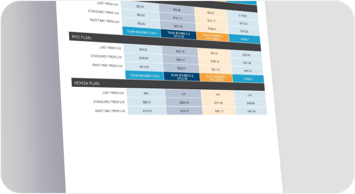 Health Plan Premiums (Bi-weekly Team Member Contributions – 26 Contributions) HEALTH PLAN PREMIUMS (BI-WEEKLY TEAM MEMBER CONTRIBUTIONS – 26 CONTRIBUTIONS) TEAM MEMBER & TEAM MEMBER + TEAM MEMBER ONLY FAMILY SPOUSE CHILD(REN) EPO PLAN JUST PREMIUM $21.89 $95.40 $43.27 $118.85 STANDARD PREMIUM $50.52 $163.16 $100.17 $214.65 PART-TIME PREMIUM $50.56 $274.74 $184.36 $356.20 TEAM MEMBER & TEAM MEMBER + TEAM MEMBER ONLY FAMILY SPOUSE CHILD(REN) PPO PLAN JUST PREMIUM $48.23 $180.39 $90.93 $228.96 STANDARD PREMIUM $100.54 $257.67 $180.75 $337.88 PART-TIME PREMIUM $146.51 $365.53 $271.72 $490.74 TEAM MEMBER & TEAM MEMBER + TEAM MEMBER ONLY FAMILY SPOUSE CHILD(REN) HDHSA PLAN JUST PREMIUM N/A N/A N/A N/A STANDARD PREMIUM $82.00 $222.74 $191.00 $308.00 PART-TIME PREMIUM $119.50 $315.97 $287.12 $405.50 24